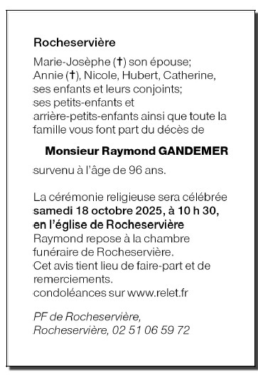 Décédé à Rocheservière (85620, France) le mercredi 15 octobre 2025 à l'âge de 96 ans