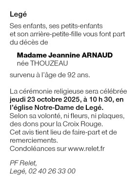 Décédée à La Roche-sur-Yon (85000, France) le dimanche 19 octobre 2025 à l'âge de 92 ans