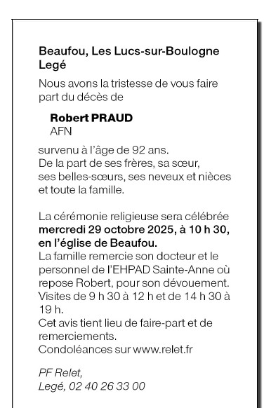 Décédé à Les Lucs-sur-Boulogne (85170, France) le dimanche 26 octobre 2025 à l'âge de 92 ans