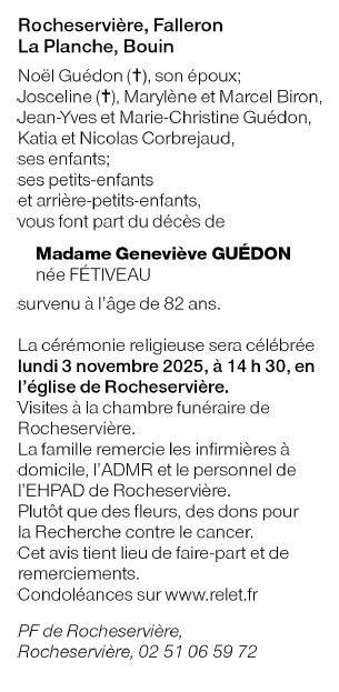 Décédée à Rocheservière (85620, France) le jeudi 30 octobre 2025 à l'âge de 82 ans