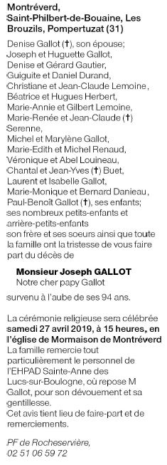 Décédé à Les Lucs-sur-Boulogne (85170, France) le jeudi 25 avril 2019 à l'âge de 93 ans