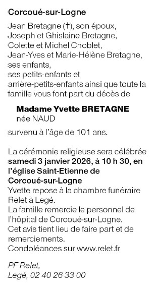 Décédée à Corcoué-sur-Logne (44650, France) le mardi 30 décembre 2025 à l'âge de 101 ans