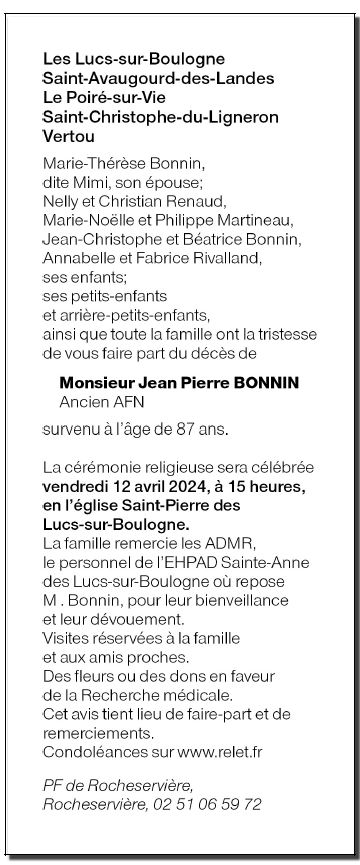 Décédé à Les Lucs-sur-Boulogne (85170, France) le mardi 9 avril 2024 à l'âge de 87 ans