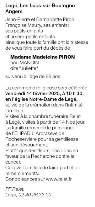 Décédée à Rocheservière (85620, France) le dimanche 9 février 2025 à l'âge de 87 ans