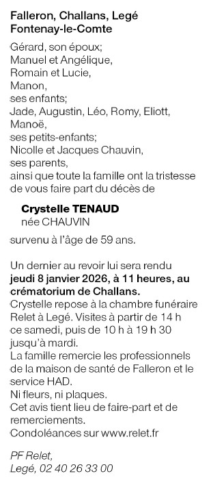 Décédée à Falleron (85670, France) le vendredi 2 janvier 2026 à l'âge de 59 ans