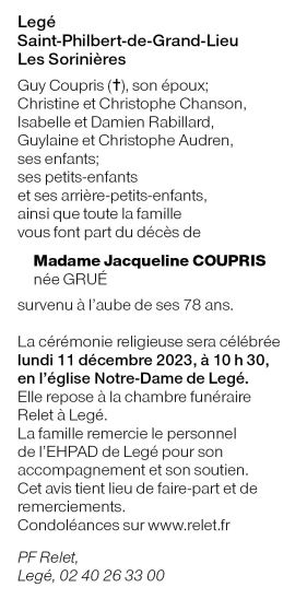 Décédée à Legé (44650, France) le jeudi 7 décembre 2023 à l'âge de 77 ans