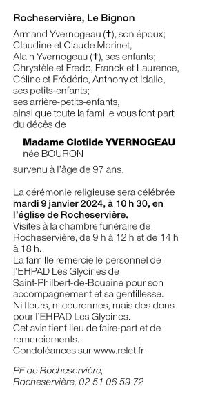 Décédée à Saint-Philbert-de-Bouaine (85660, France) le samedi 6 janvier 2024 à l'âge de 97 ans