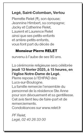 Décédé à Les Lucs-sur-Boulogne (85170, France) le mardi 11 février 2025 à l'âge de 89 ans