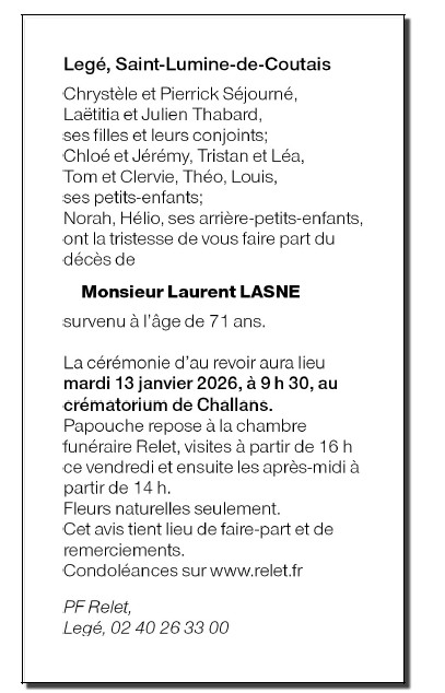 Décédé à Legé (44650, France) le jeudi 8 janvier 2026 à l'âge de 71 ans