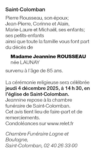 Décédée à Saint-Colomban (44310, France) le lundi 1 décembre 2025 à l'âge de 85 ans