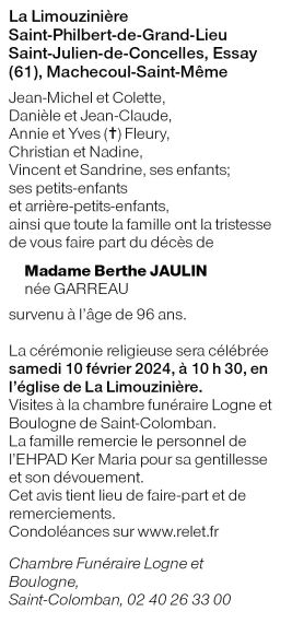 Décédée à La Limouzinière (44310, France) le lundi 5 février 2024 à l'âge de 96 ans