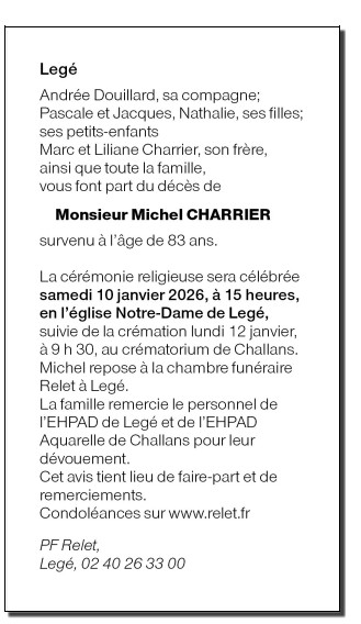 Décédé à Challans (85300, France) le mercredi 7 janvier 2026 à l'âge de 83 ans