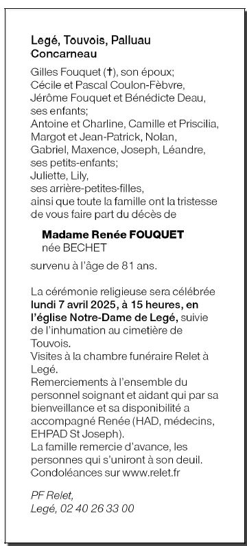 Décédée à Legé (44650, France) le vendredi 4 avril 2025 à l'âge de 81 ans