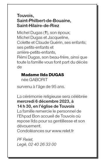 Décédée à Challans (85300, France) le samedi 2 décembre 2023 à l'âge de 95 ans