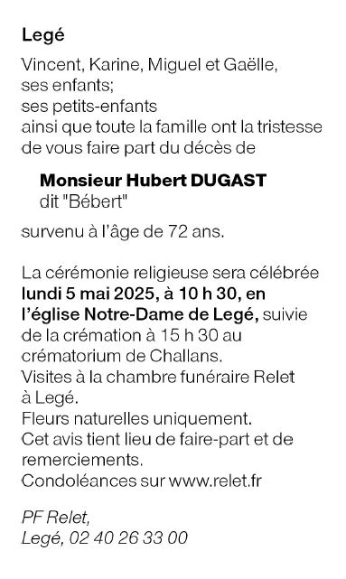 Décédé à Legé (44650, France) le mercredi 30 avril 2025 à l'âge de 72 ans