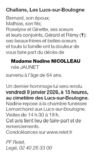 Décédée à Challans (85300, France) le mardi 6 janvier 2026 à l'âge de 64 ans
