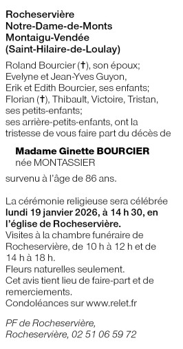 Décédée à Rocheservière (85620, France) le jeudi 15 janvier 2026 à l'âge de 86 ans