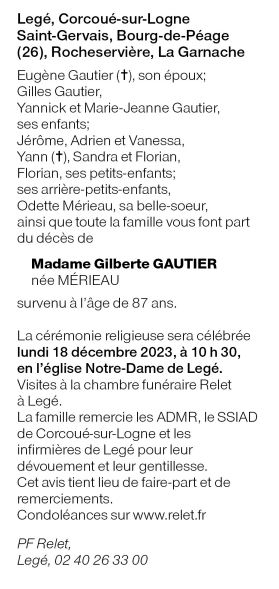 Décédée à Legé (44650, France) le jeudi 14 décembre 2023 à l'âge de 87 ans