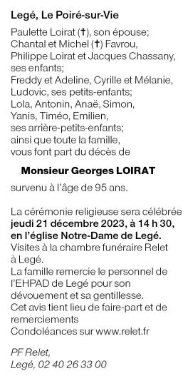 Décédé à Legé (44650, France) le mardi 19 décembre 2023 à l'âge de 95 ans