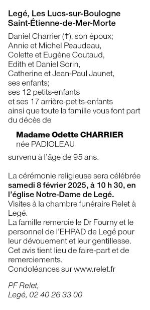 Décédée à Legé (44650, France) le jeudi 6 février 2025 à l'âge de 95 ans